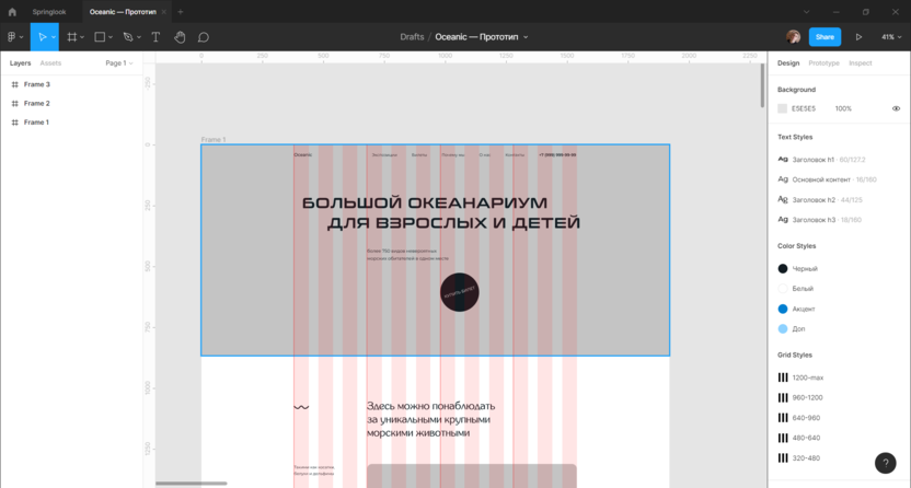 Выглядит все это примерно так: фреймы, слои, элементы, сетка и много дизайна.