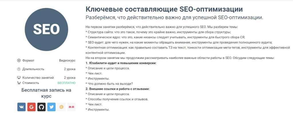 Формат: Видеокурсы на русском языке, состоящие из 2 уроков. Курс рассчитан на начинающих специалистов в области SEO.