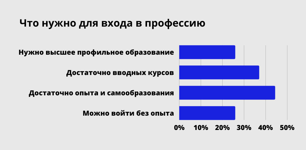 44,4% опрошенных нами специалистов считают, что для входа в профессию достаточно только опыта и самообразования, а 37% говорят о том, что необходимо пройти вводные курсы.