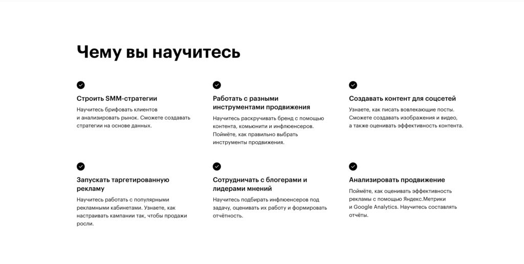 Еще одна полноценная программа переподготовки «с нуля». Можно выбрать карьерные треки «Фрилансер» — 6 420 рублей в месяц, «Менеджер» — 9 678 рублей в месяц или «Менеджер PRO» — 12 683 рублей в месяц, которые отличаются количеством уроков и глубиной погружения. На курсе научитесь всем базовым навыкам сммщика, а специалисты Skillbox помогут составить резюме и подготовиться к собеседованиям.