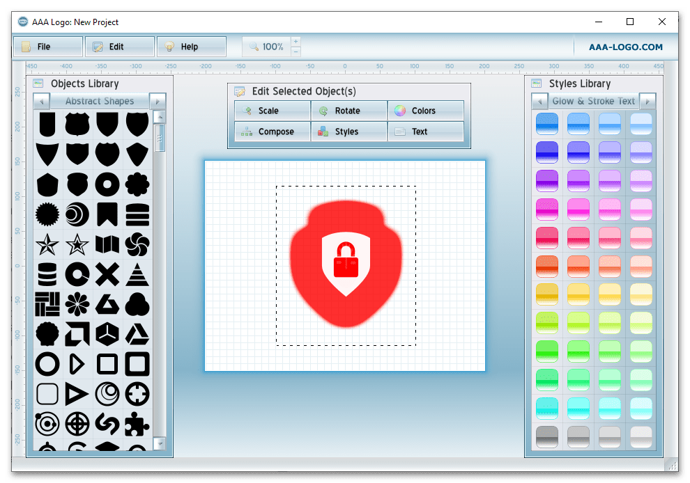 Суть в том, чтобы взять из встроенной библиотеки готовые объекты и составить изображение, которое вы видите в качестве логотипа. Панель со стилями позволит изменить цвет, добавить блеск, отражение и градиент, а блок инструментов повернуть элементы, изменить их пропорции, структуру логотипа, оттенок и насыщенность цвета, а также применить дополнительные эффекты к уже выбранным стилям, например тень или свечение.