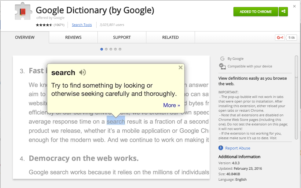Признаемся, читая статьи в наших любимых блогах, мы иногда сталкиваемся со словом, значение которого не знаем. Google Dictionary — это расширение, призванное решить эту проблему. Это расширение Google Chrome позволяет узнать значение каждого слова, которое вы видите на веб-странице.