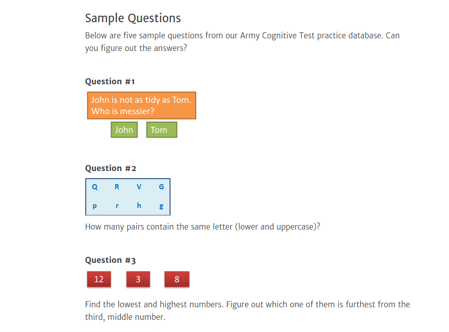 Здесь дано 15 минут на выполнение 50 заданий. Вам предстоит выбрать правильные варианты ответов, сравнить утверждения, продолжить числовые ряды, решить математические и визуальные задачи. Оцениваются такие способности: вербальные, числовые, логические, пространственные, а также концентрация и распределение внимания.