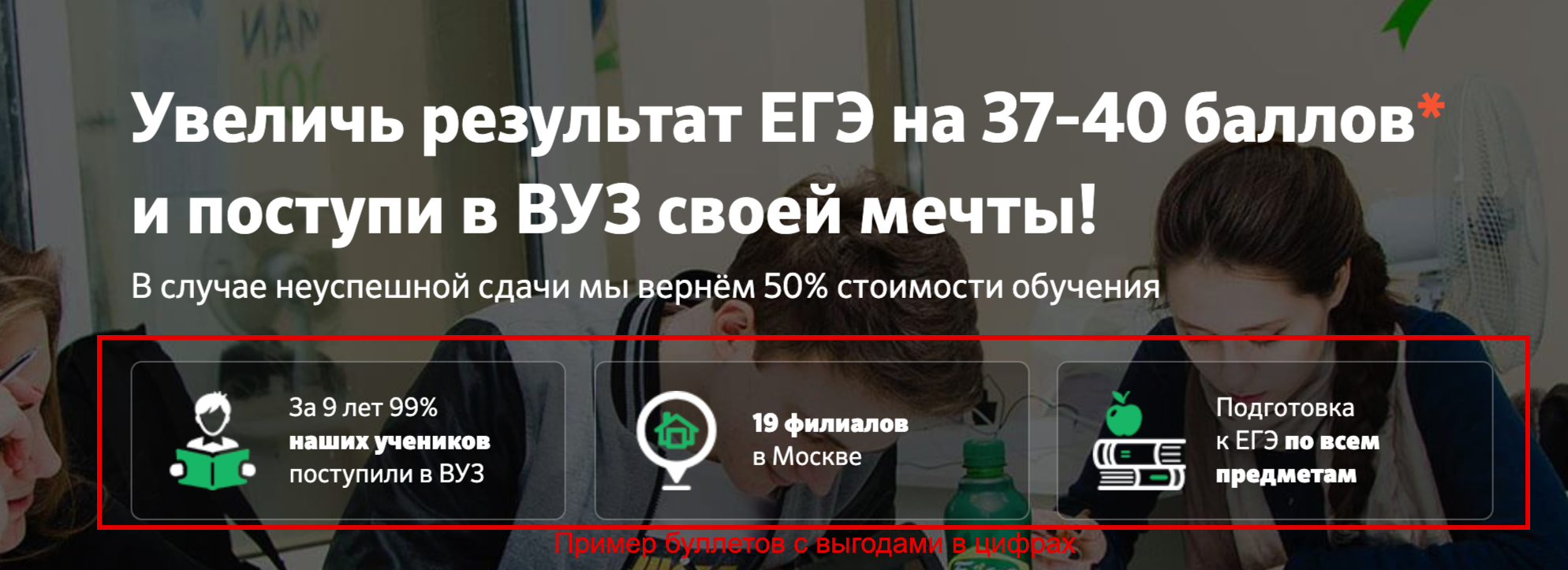 В подзаголовке и буллетах мы также делаем акцент на выгоды. Что именно (в цифрах и фактах) получит пользователь от сотрудничества с вами? Мы можем использовать факты о продукте и о компании в целом (например, связанные с сервисом). Ограничение — не стоит расписывать на целый абзац текста, достаточно 6-8 слов в предложении. Избегайте использования Сaps Lock в подзаголовках, это снижает читаемость длинных предложений.