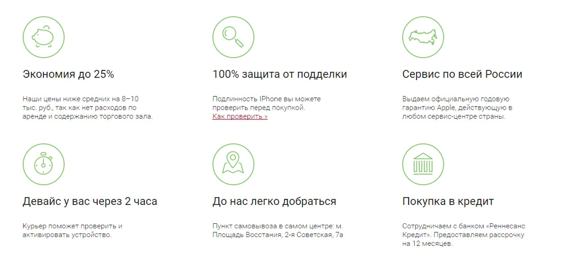 Здесь компания не только рассказывает о своих преимуществах, но и раскрывает их с точки зрения пользы для клиента. Он сразу видит выгоду: у компании цены ниже средних на 8-10 тысяч рублей, она выдает официальную гарантию, производит доставку за два часа и так далее.