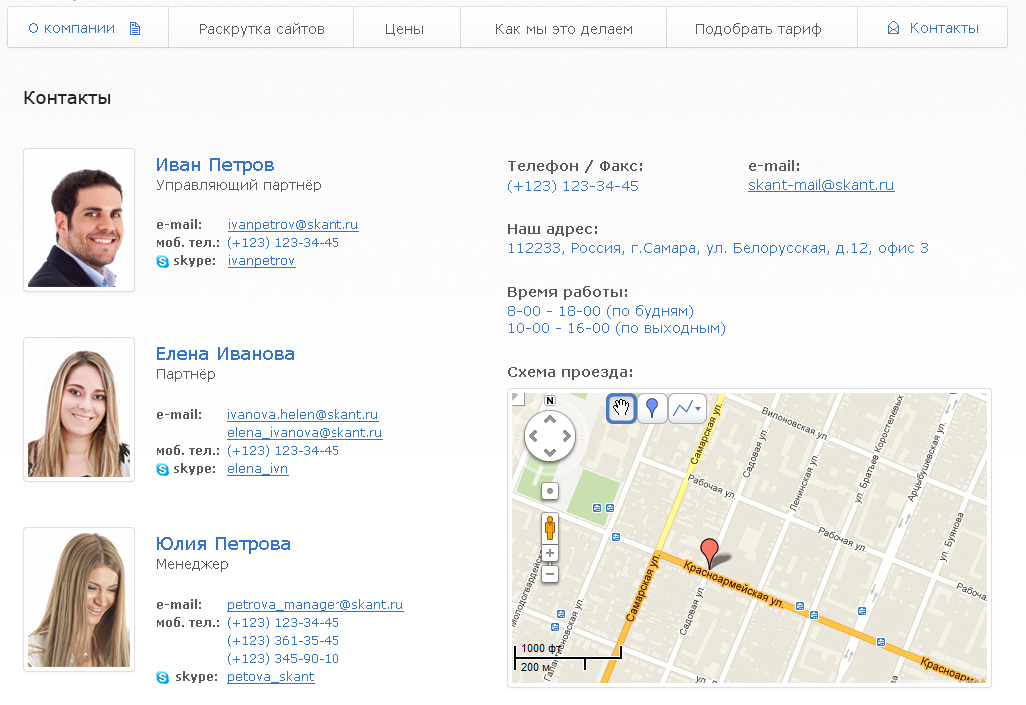 Кроме уже упомянутой контактной формы, можно интегрировать карту с маршрутом проезда, указать телефоны в мобильном и городском формате, адрес электронной почты, никнейм в Skype и контакты в каком-нибудь популярном мессенджере типа Viber или Telegram.