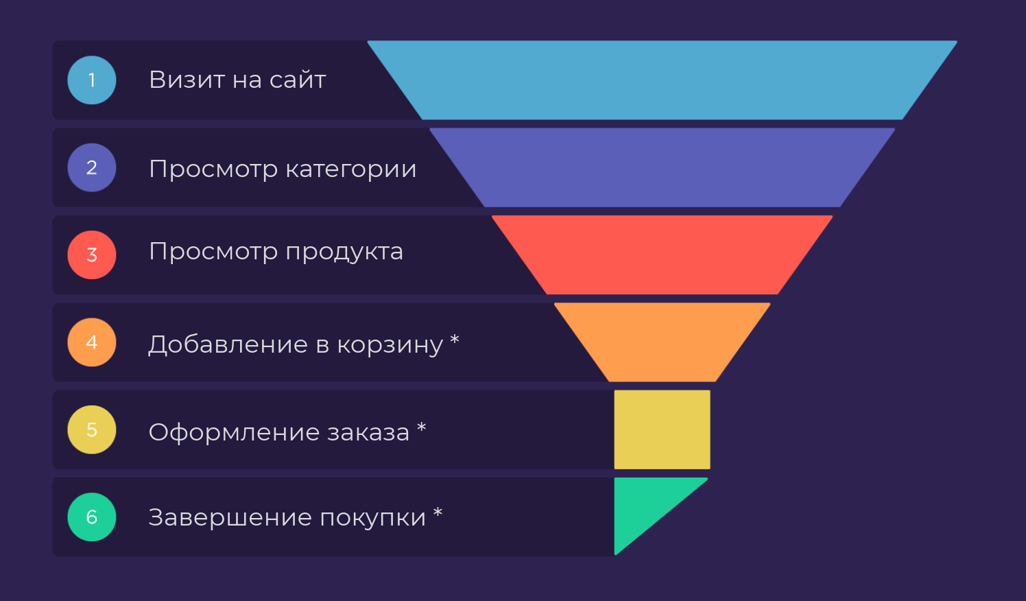 Обычно покупатели совершают целевые действия не сразу. До покупки товара или услуги нужно пройти определенную цепочку пути. Такая цепочка еще называется воронка продаж. Это регистрация, прочтение материалов, сравнение характеристик, добавление в корзину, заполнение форм итд.