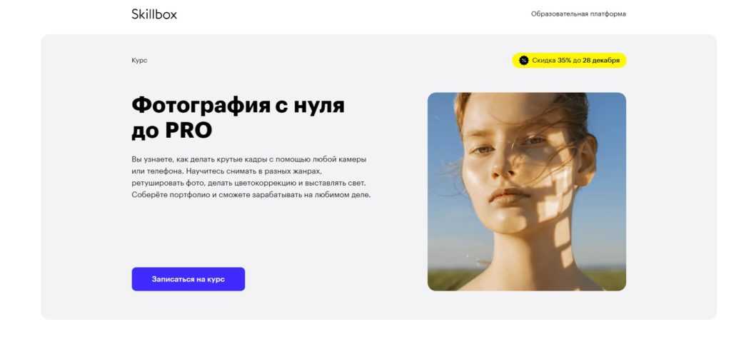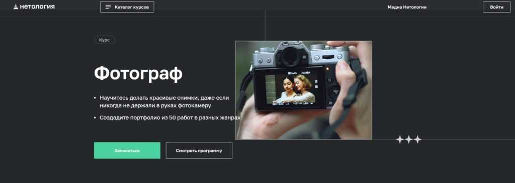 После обучения будущий фотограф научится новым жанрам, как правильно настраивать технику, подбирать цвет и ретушировать фото в специальных программах для конечного результата. Также по окончании ученик получает портфолио с более чем 50 работами. Нетология помогает лучшим фотографам в будущем трудоустройстве.