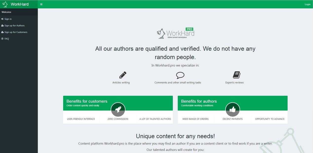 Проект WorkHard.pro вырос из русскоязычной биржи WorkHard.online. Опробовав бизнес-модель в Рунете, создатели перенесли платформу в западный сегмент – так появился сайт копирайтинга на английском языке, изначально ориентированный на авторов из СНГ.