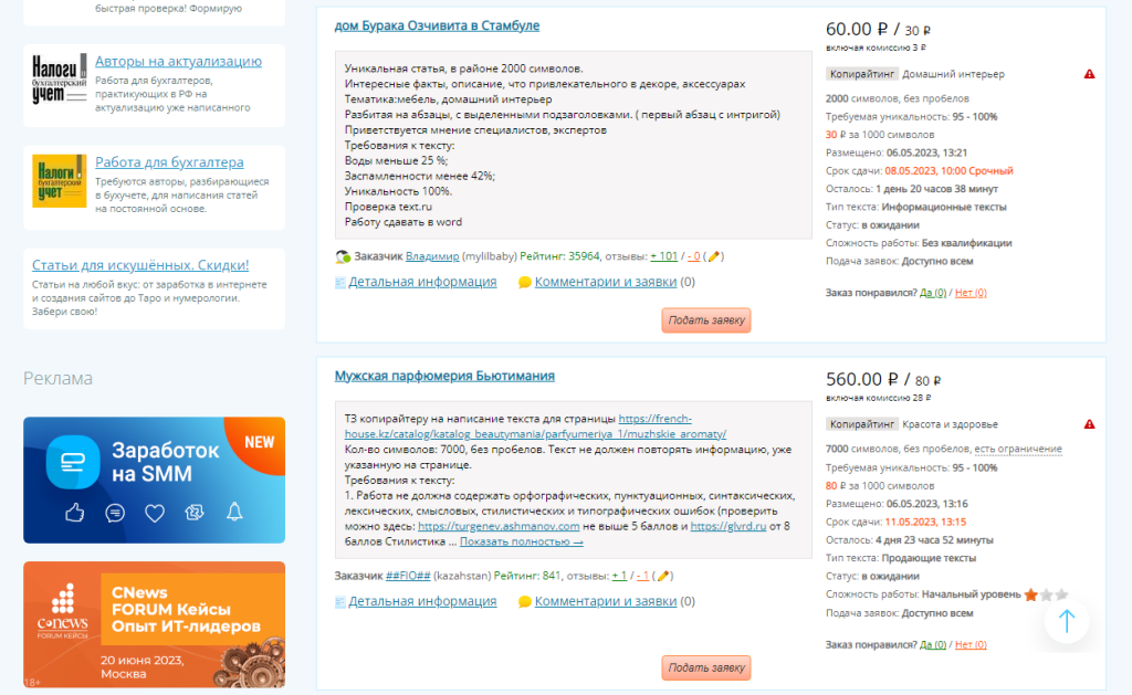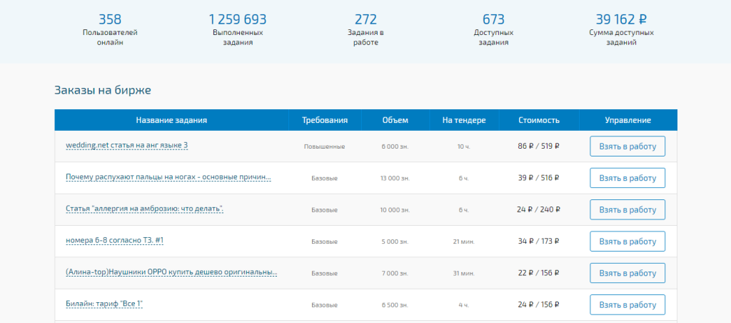- Автоматическое распределение задач: клиент размещает заказ, его берёт в работу любой копирайтер – никакого тендера нет.