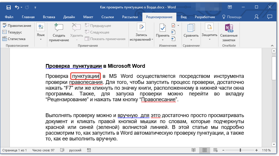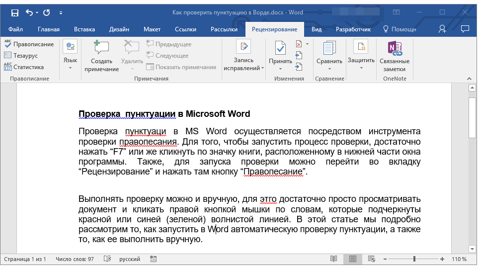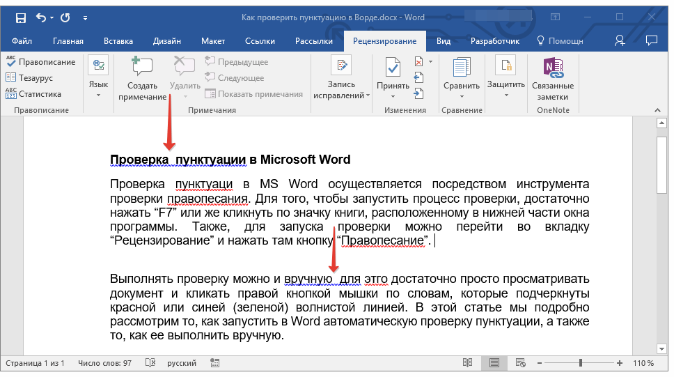Внимательно просмотрите документ и найдите в нем красные и синие (зеленые, в зависимости от версии Ворда). Как было сказано в первой половине статьи, слова, подчеркнутые красной волнистой линией, написаны с ошибками. Фразы и предложения, подчеркнутые синей (зеленой) волнистой линией, неправильно составлены.