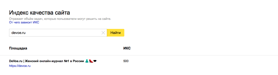 Формулу подсчета ИКС Яндекс не раскрывает, чтобы избежать попыток накрутки данного показателя. По официальным данным, ИКС, как говорилось ранее, будет рассчитываться на основе всех имеющихся у поисковой компании данных о сайте и бизнесе, стоящим за ним. Основной критерий — удовлетворенность пользователей ресурсом, которое в свою очередь складывается из сотен других факторов и метрик, а также размера аудитории ресурса, уровня доверия посетителей.
