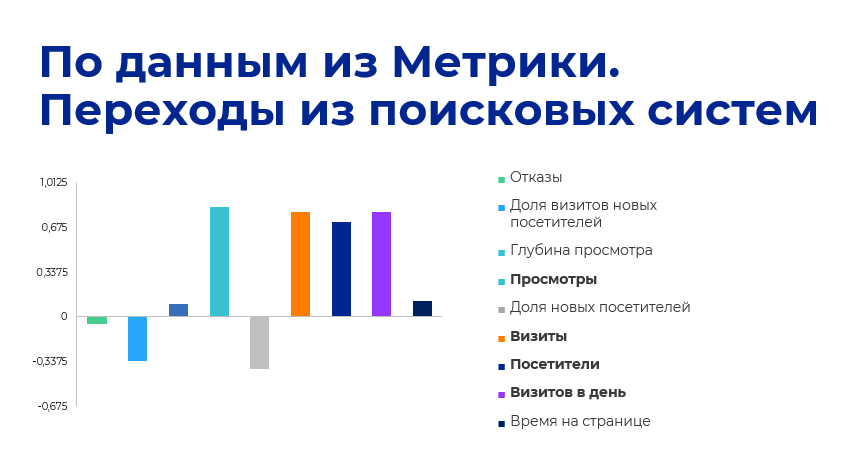 Исследование подтвердило предыдущие выводы: визиты, посетители, просмотры везде имеют высокий коэффициент корреляции со значением ИКС. Средний коэффициент корреляции виден у таких параметров, как «Доля новых посетителей» и «Доля визитов новых посетителей», особенно в разрезе «Итого и среднее» и «Переходы из поисковых систем». Сам коэффициент при этом отрицательный, что означает, что ИКС может быть хуже, если у вас новые посетители.