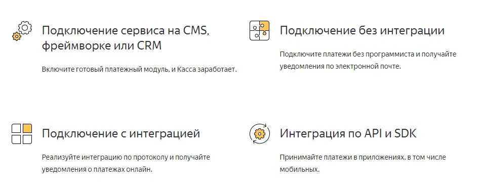 Подключение Яндекс.Кассы завешается интеграцией сервиса — подключением, настройкой приема выплат, а также проверкой работоспособности системы. Подключение может производиться с помощью настройки CMS, с интеграцией и без нее.