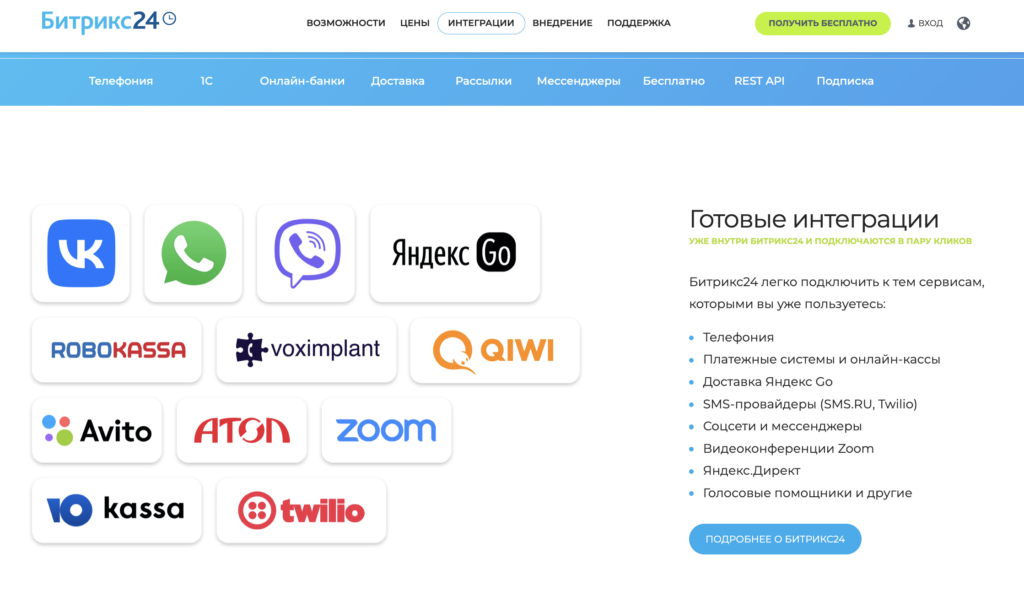 готовые интеграции с CRM «Битрикс24» и конструктором сайтов Tilda,