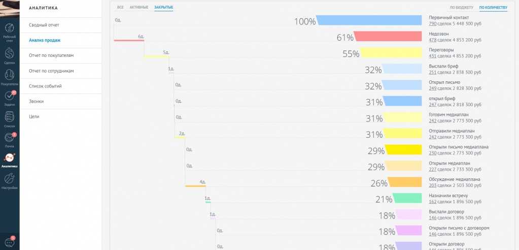 - изучает продолжительность каждого этапа сделки, время оборота, сроки до повторного взаимодействия с клиентом;