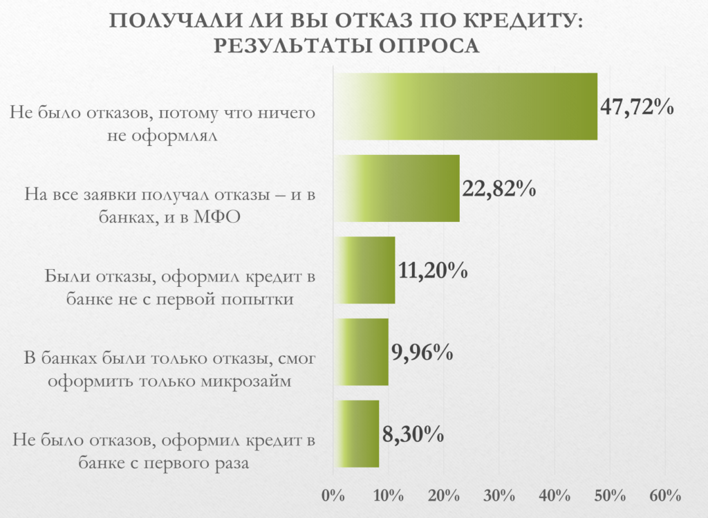 - около 44% опрошенных получают отказы на все попытки взять кредит;