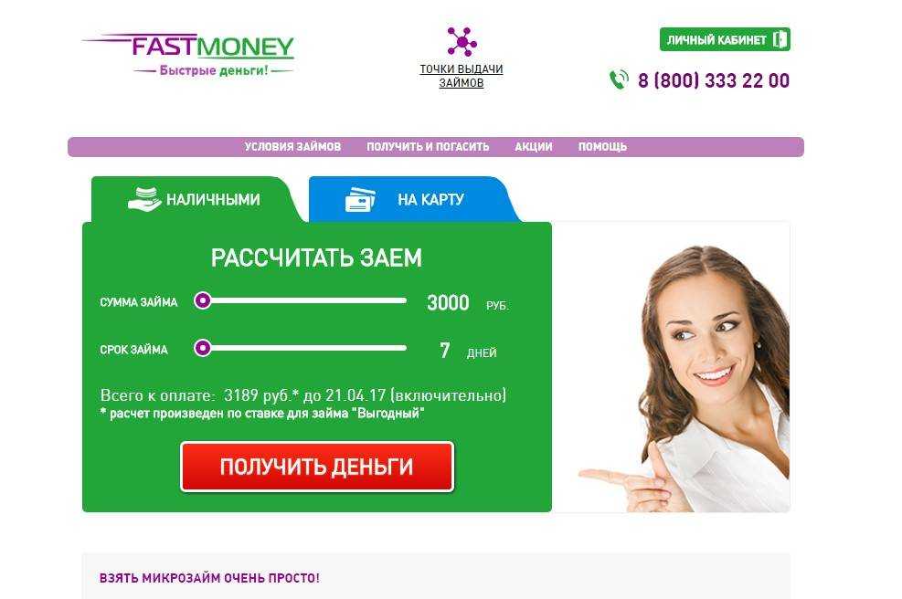 FastMoney занимается микрокредитами онлайн до 30 000 рублей. Получение средств возможно с одним лишь паспортом без справок о доходах. Деньги перечисляются на карточку, индивидуальный счет кредитозаемщика или электронный кошелек. Микрозаймы выдаются на 16 дней с посуточным начислением процентов. Если не знаете, что делать и где оформить заем, стоит обратиться в FastMoney. МФО очень популярна среди заемщиков и имеет хорошие отзывы от постоянных клиентов.