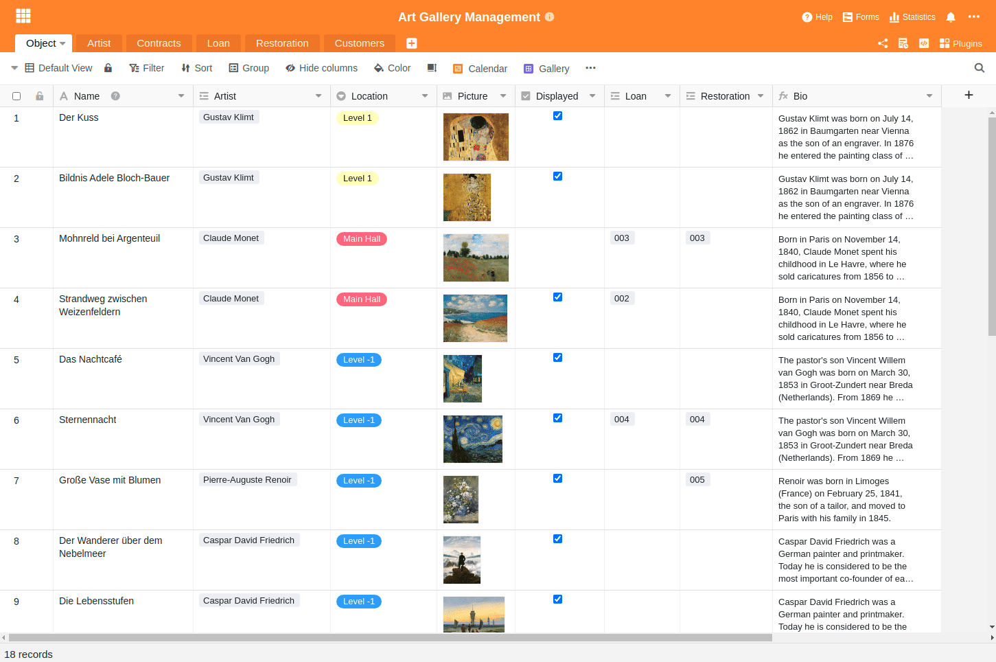 Наш шаблон Art Gallery Management есть несколько образцов записей, чтобы показать вам возможности. Отдельные предметы искусства находятся в центре управления коллекцией и связаны с художниками. В то же время указывается, где в настоящее время находится произведение искусства, а также ссылки на планируемые реставрации и займы. В любой момент можно расширить коллекцию, включив в нее ссылки на общественность, творческие периоды или категории искусства.