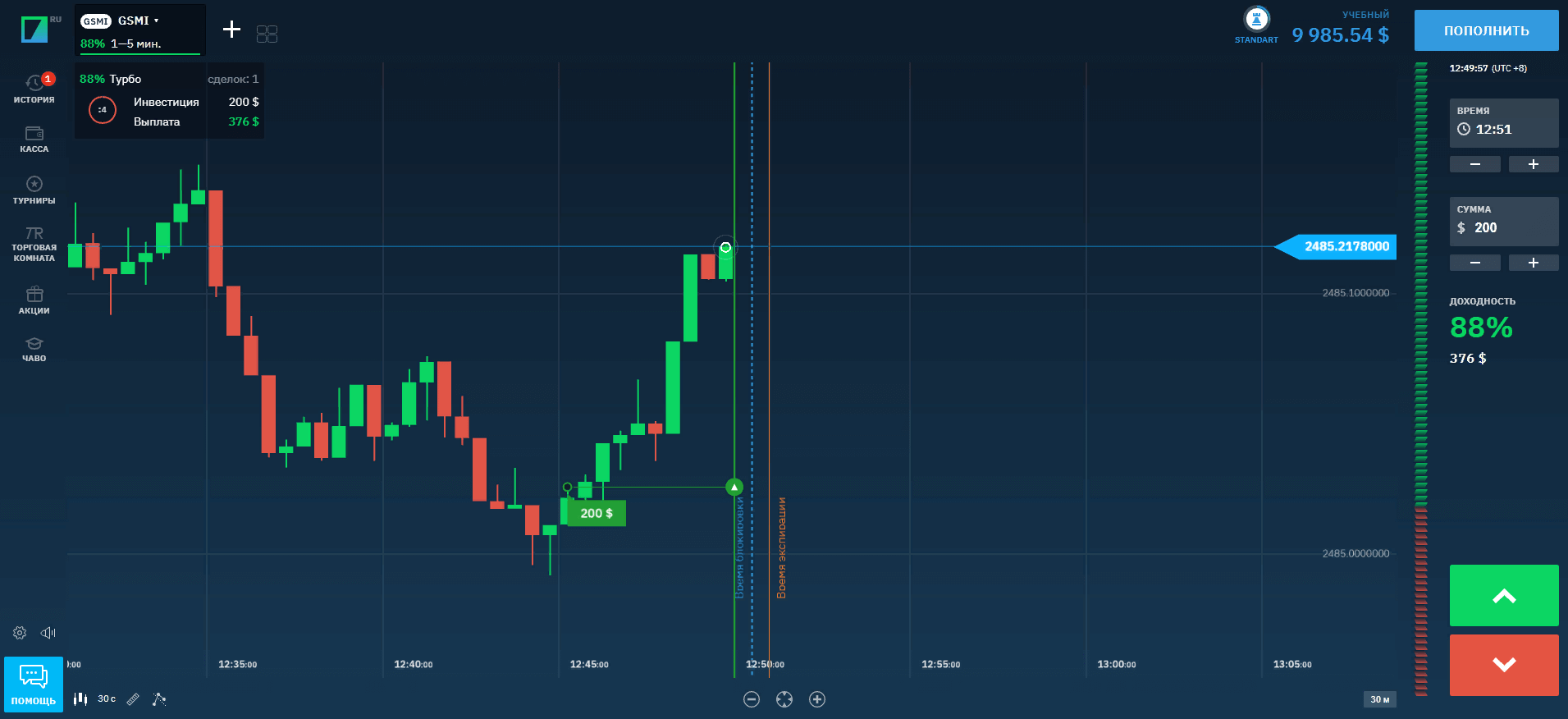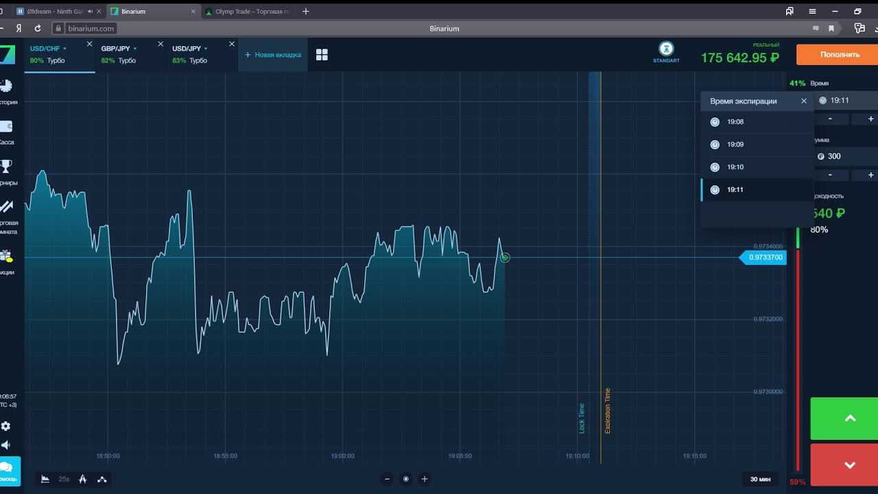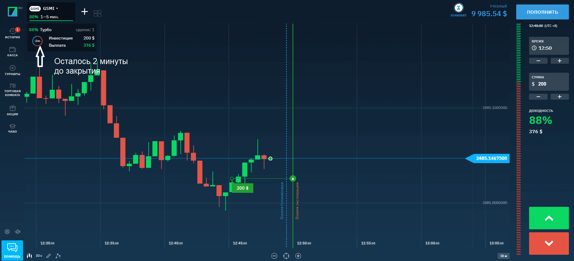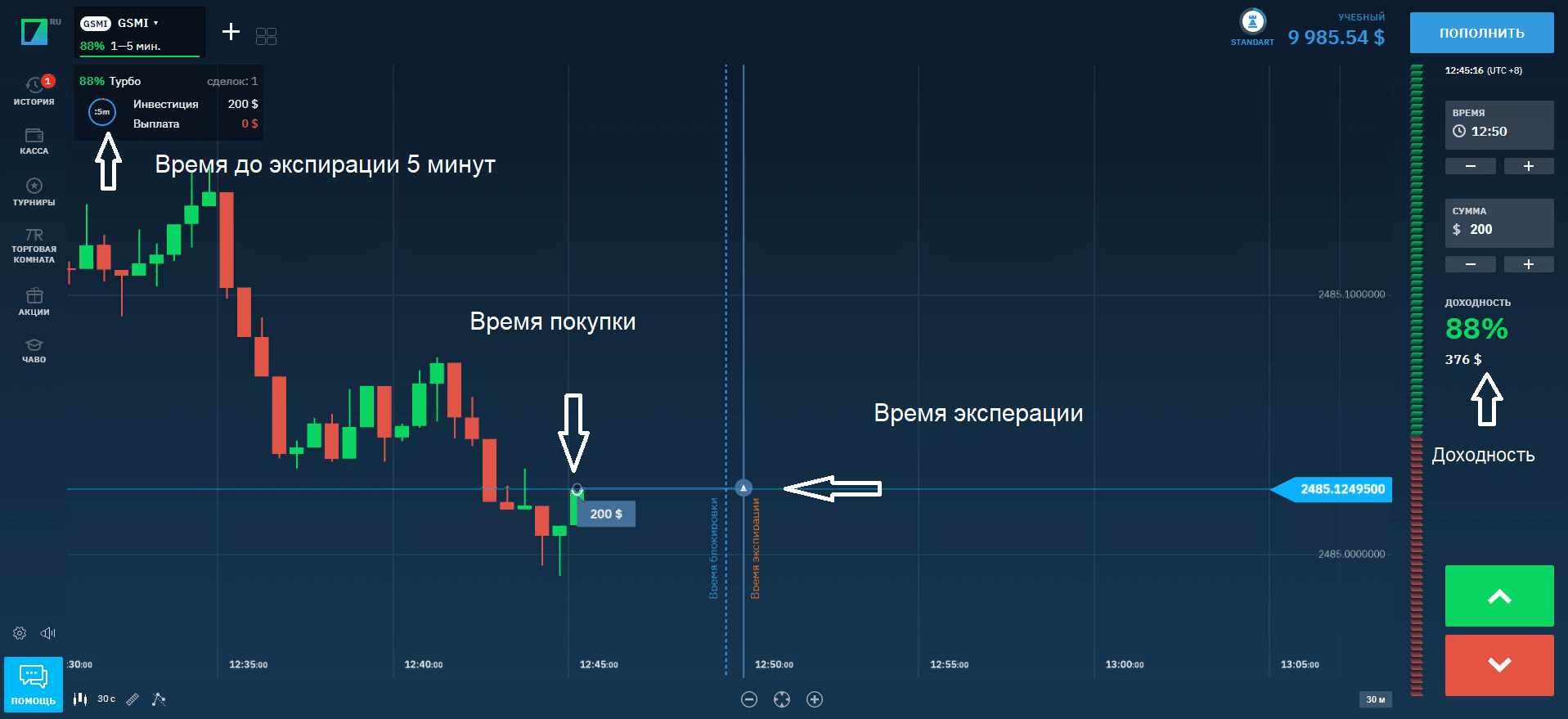 Зашёл на торговую платформу одного из брокеров и покажу пример, как это делается в реальности. На графике обозначено время заключения сделки, время экспирации, доходность.