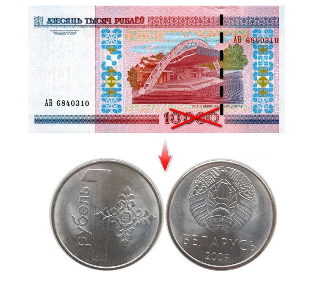 Старые белорусские рубли будут меняться на новые с коэффициентом 10000:1, таким образом, нынешние банкноты самого низкого номинала 100 рублей будут заменены на монеты достоинством 1 копейка.