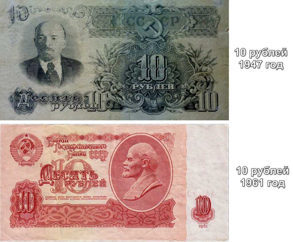 - В СССР было 3 деноминации: в 1922г. — 10000:1, в 1947г. — 10:1, в 1961г. — 10:1;