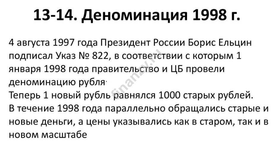 Наконец, заключительная реформа 1998 года. К концу 97 года доллар стоил 5 960 рублей, в то время как в 93 году его стоимость составляла 417 рублей. Эта реформа прошла достаточно плавно и завершилась лишь в 2002 году. Она сопровождалась деноминацией в 1000 раз, то есть 1000 старых рублей соответствовали 1 новому. Именно тогда и появились наши современные деньги.