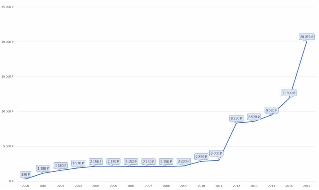 На графике видим яркий пример девальвации валюты на протяжении 16-ти лет. В то время размер получаемой зарплаты измерялся миллионами (правда, не все иностранцы понимали, что 2 млн. рублей, это всего лишь 100 долларов США). Для того чтобы как то облегчить населению и бизнесу процесс использования наличных денег, было принято убрать 4 нуля.