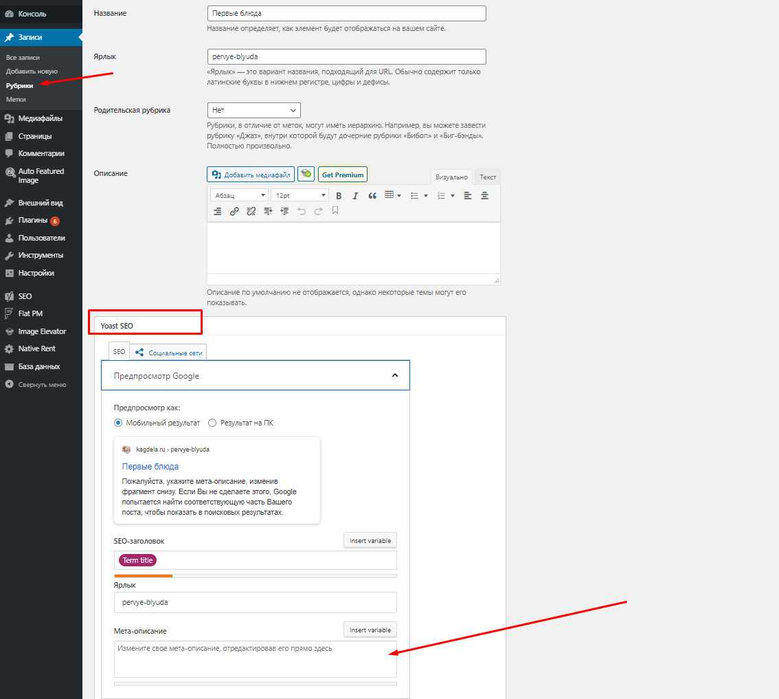 Для этого переходим в рубрики (аналогично с метками), и выбираем рубрику и в самом низу спускаемся и заполняем несколько слов, о чем эта рубрика. Здесь не нужно много слов. Достаточно 1-3 предложения. Эта информация не будет отображаться на странице, а служит для мета тега Description.