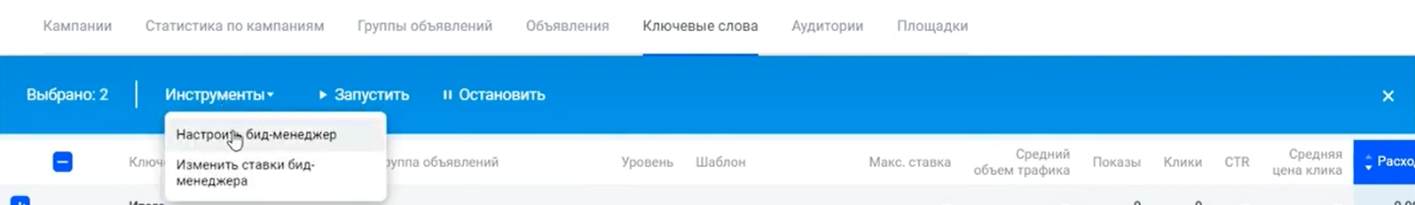 Зайдите в статистику по ключевым словам и укажите те, для которых собираетесь создать шаблон. Кликните на «Инструменты» — «Настроить бид-менеджер».