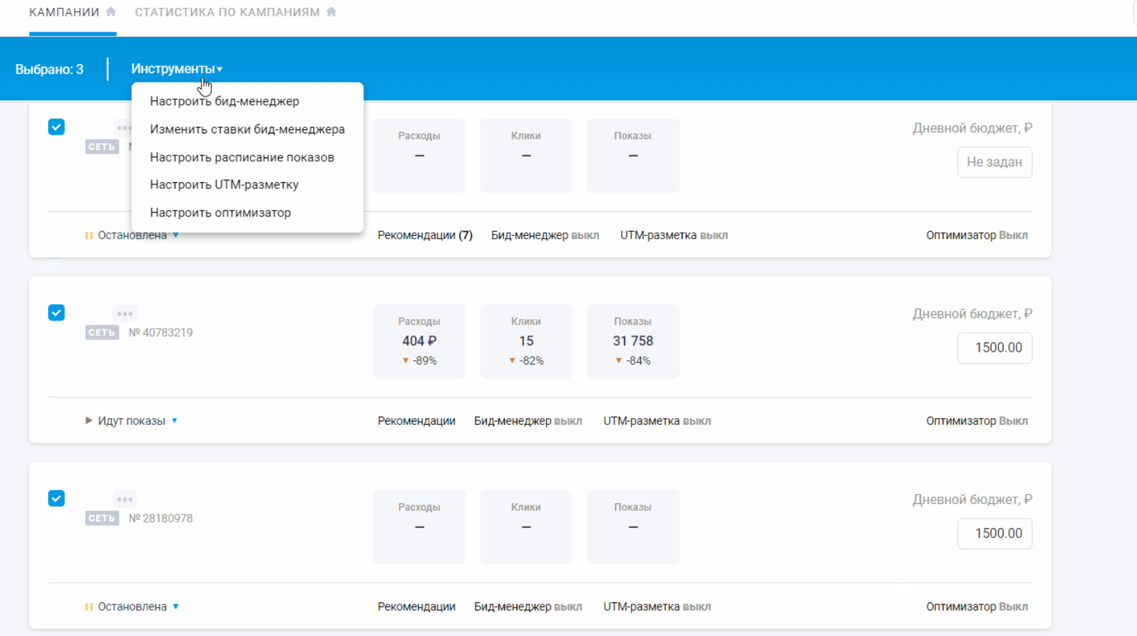 Вы можете установить один шаблон на несколько кампаний и одновременно менять в них значение максимальной ставки. Задавать массовую корректировку ставок можно в разделах «Кампании», «Статистика по кампаниям» или «Инструменты» — «Изменить ставки бид-менеджера». Разберем на примере настройки в «Кампаниях»: