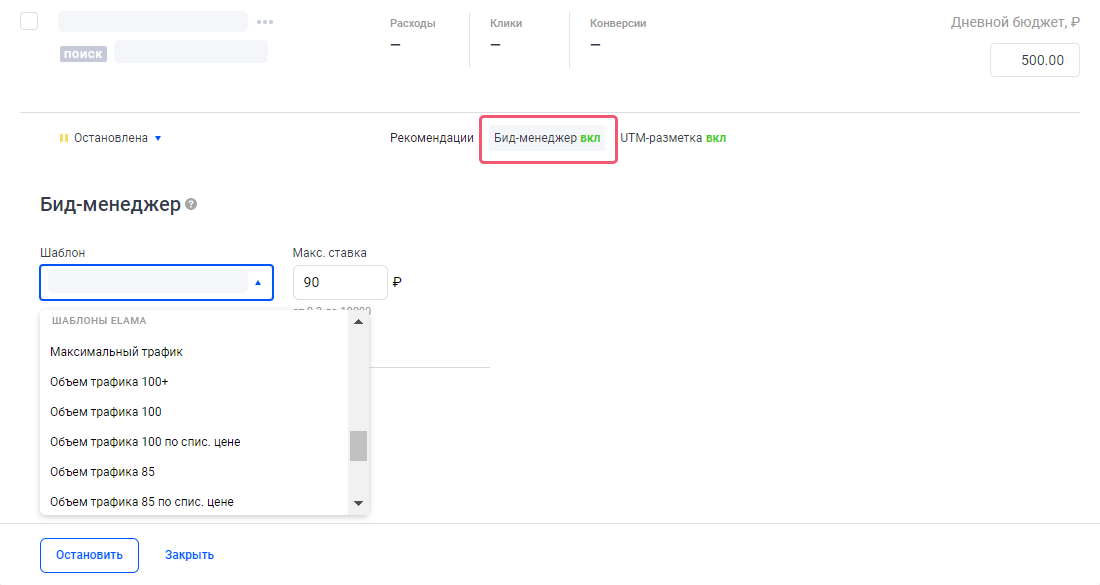 Вы можете задать уникальные шаблоны биддера для выбранных ключевых слов. Например, для тех, которые приносят больше конверсий, выбрать шаблон «Максимальный трафик» с более высоким порогом ставки.