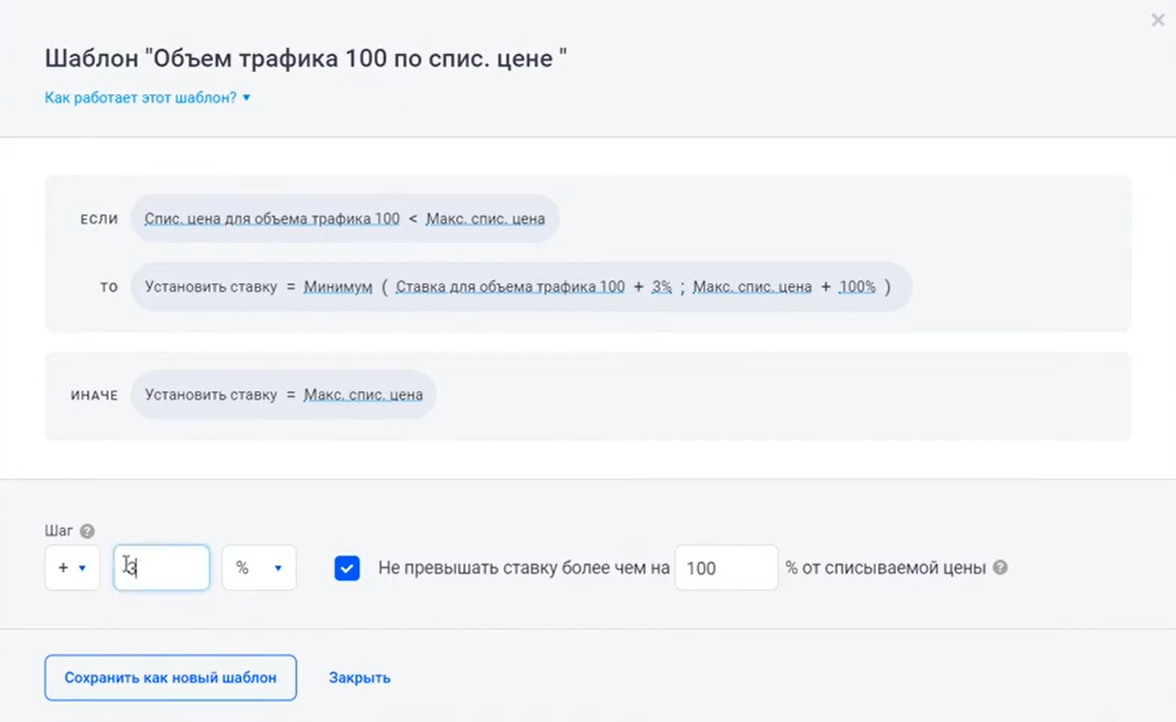 шаг торгов в процентах или рублях. Вы указываете, насколько ставка биддера может быть больше или меньше рекомендованной ставки для объема трафика, который вы выбрали. Изменить настройку можно во всех шаблонах;