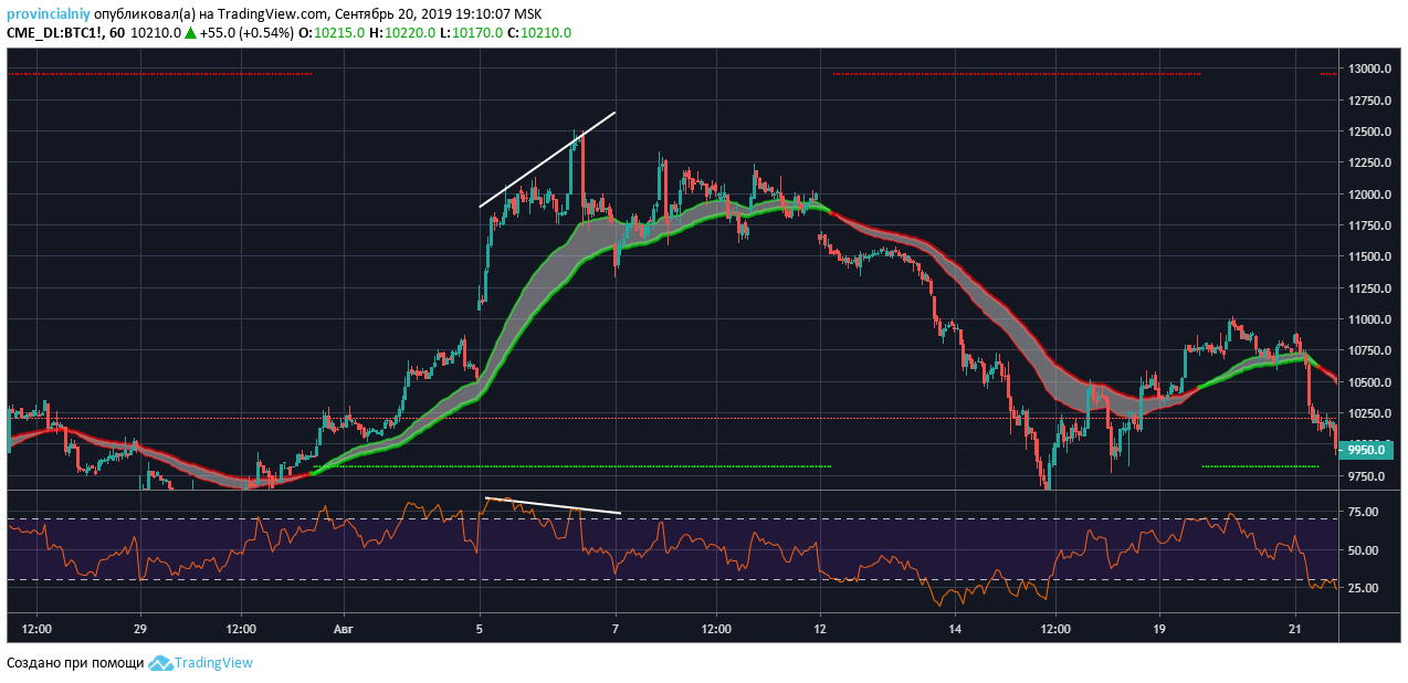 И теперь, в такой ситуации мы очень хорошо можем предположить снижение. Во-первых, у нас есть не перекрытый ГЭП снизу, во-вторых у нас образовалась дивергенция на снижение. Мы входим в сделку на понижение в момент формации дивергенции и выставляем тейк-профит на перекрытие ГЭПа, то есть на его нижней грани.