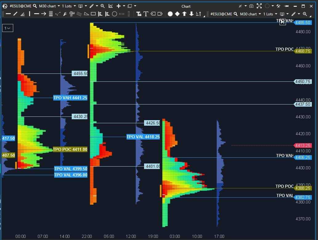 При анализе графика обращайте внимание на светло-серые зоны с указателем POC (Point of Control — точка контроля) и зона стоимости (Value Area). Вторая показывает, где рынок находится в состоянии баланса