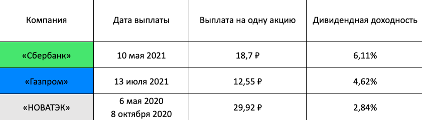 Для примера мы взяли три компании: «Сбербанк», «Газпром» и «НОВАТЭК». Посмотрите, какие они делали выплаты за последний год.