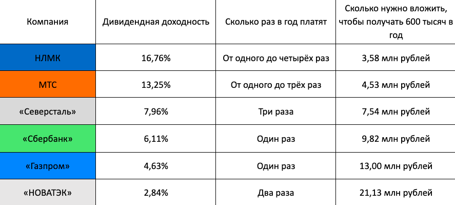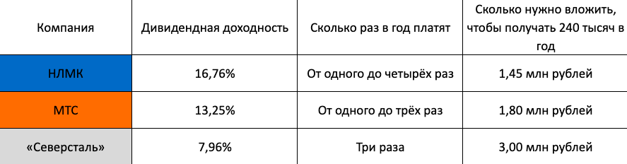 Чтобы получать 20 тысяч в месяц или 240 тысяч в год с этих же компаний, нужно вложить в два раза больше денег или найти другие, где дивидендная доходность выше, например: НЛМК, МТС и «Северсталь».