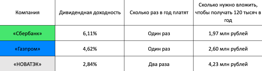 Вот сколько нужно инвестировать в каждую из них, чтобы зарабатывать на дивидендах 120 тысяч в год. При этом с полученных дивидендов ещё удержат налог 13%, поэтому фактическая сумма, которую вы получите на руки, будет меньше.