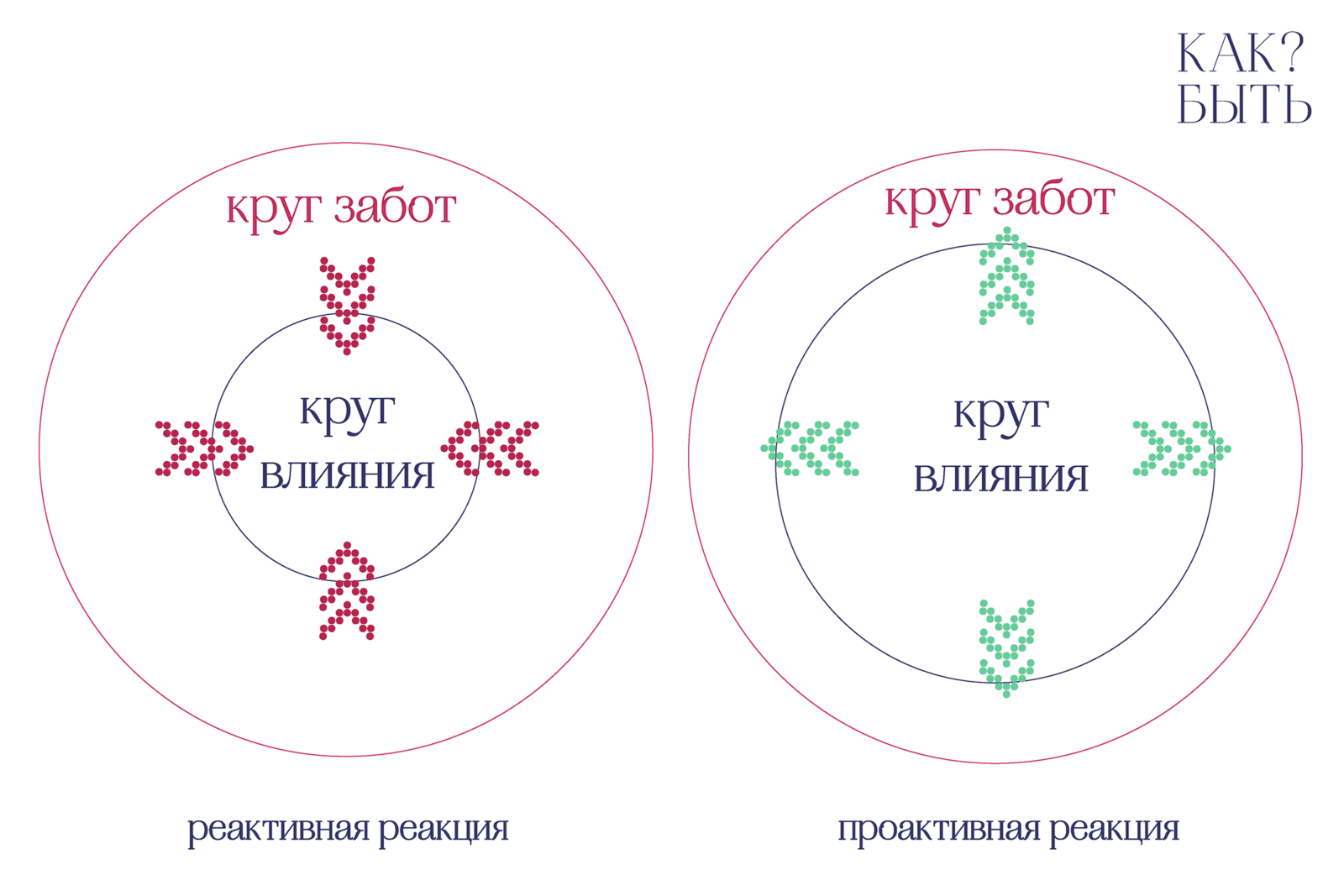 Люди с реактивным мышлением концентрируют внимание на «круге забот», поэтому им кажется, что от них ничего не зависит. Личность с проактивными взглядами сосредотачивается на «круге влияния», стараясь изменить то, что она может