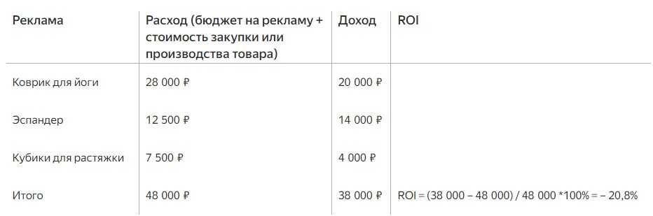 Разберем, как посчитать ROI на примере. Предположим, фирма предлагает товары для йоги, и специалист отдела маркетинга запускает контекстную рекламу ковриков для привлечения клиентов из поиска. После завершения рекламной кампании маркетолог считает ROI: