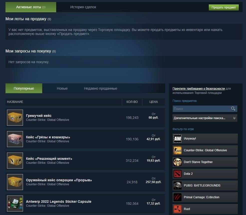 Вот общие советы о том, как настроить торговую площадку в Стиме и пользоваться ей. Отметим, что на ТП представлены не все игры (это зависит от внутренних ограничений), поэтому часть предметов из вашего инвентаря может не отображаться, будьте готовы к этому.