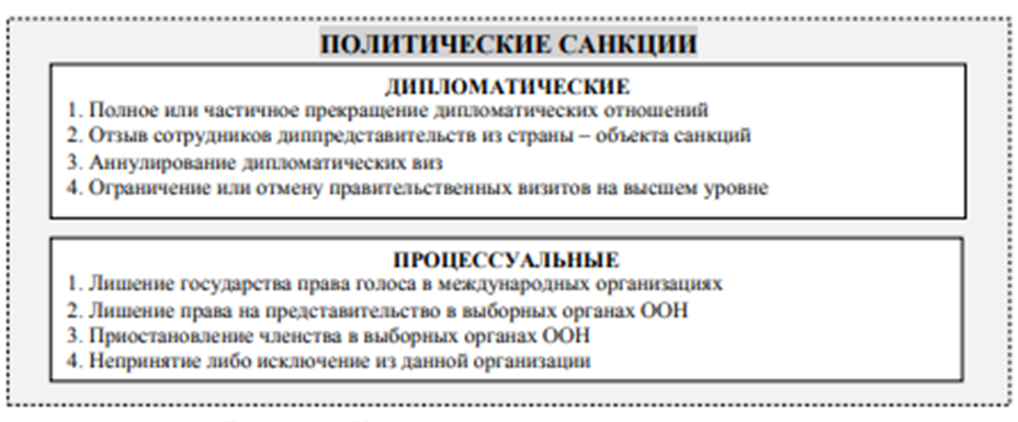 - Дипломатические санкции, включают ограничения в сфере дипломатических отношений и обменов между странами.