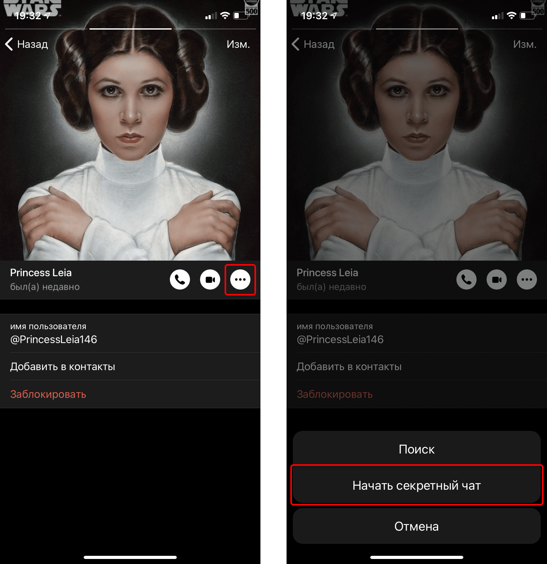 Чтобы создать «секретный» чат, необходимо открыть профиль вашего собеседника, нажать кнопку с тремя точками (иногда у нее есть подпись Еще, а иногда подписи нет) и выбрать Начать секретный чат.