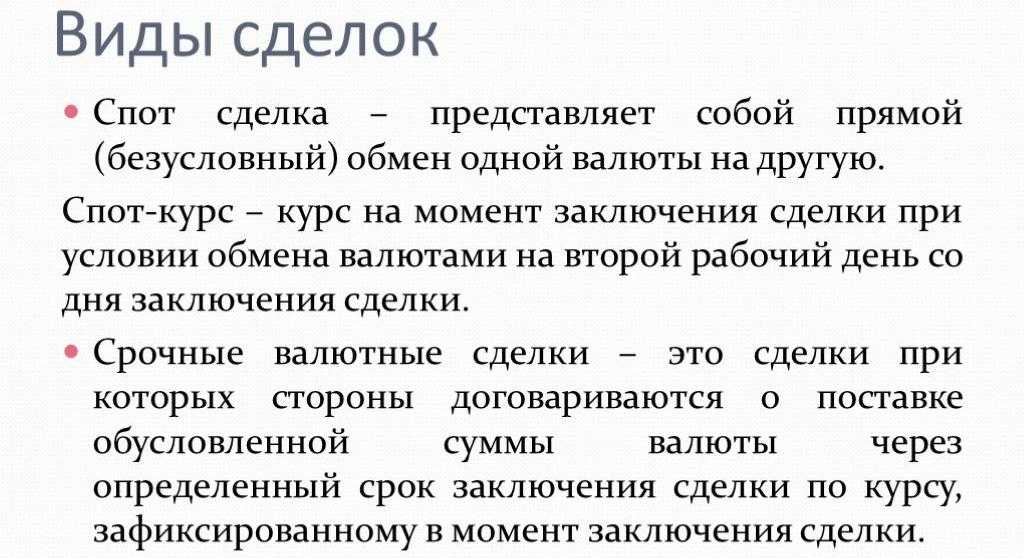 Под словом «спот-сделка» нужно понимать простой ордер, который исполняется в тот момент, когда два контрагента договорились о продаже/покупке актива. Существуют также срочные контракты, которые заключаются сразу, а исполняются спустя определенный промежуток времени.