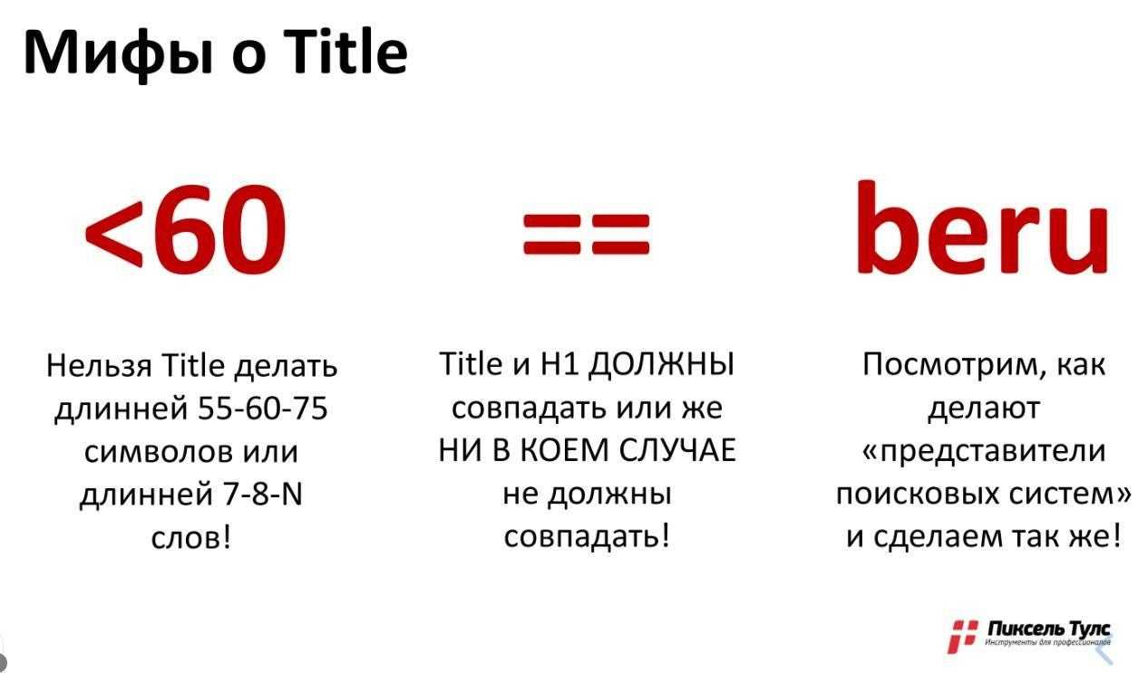 Нельзя делать тег длиннее 55-75 символов или длиннее 7-12 слов. Этот миф возник из-за того, что есть определенный набор сервисов, которые говорят, что у вас больше 55 или 75 символов и это нужно исправлять. На самом деле ничего не произойдет, этот тег индексируется и нормально работает. Просто это критерий, который взялся изначально из результатов выдачи, то есть, на выдаче тег Title обрезается, не выявляется полностью. Но это не значит, что он не работает — для SEO выявляется именно та часть тега Title, которая наиболее релевантна поисковому запросу. Есть определенные исследования, которые показывают, что вес слова после 12-го (в частности, в Google) очень сильно уменьшается. Это правда, но это не значит, что вы не можете составить тег из 14 слов. Скорее всего, эти слова все равно будут учитываться, и вы должны понимать, что это не какое-то жесткое правило.