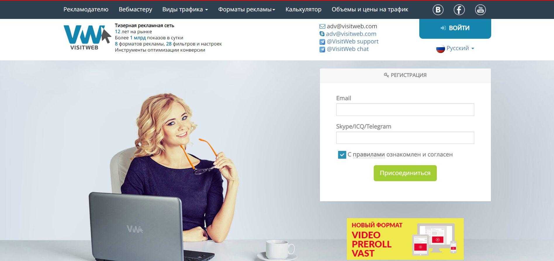 - VisitWeb — отличная площадка, которая работает на рынке рекламных сетей уже более 10 лет. Предоставляет своим партнёрам разнообразные полезные инструменты, такие как сплит-тестирования, детальная статистика, и другие возможности по оптимизации ваших конверсий. Площадка подключает ресурсы с посещаемостью не менее 50 человек в сутки.