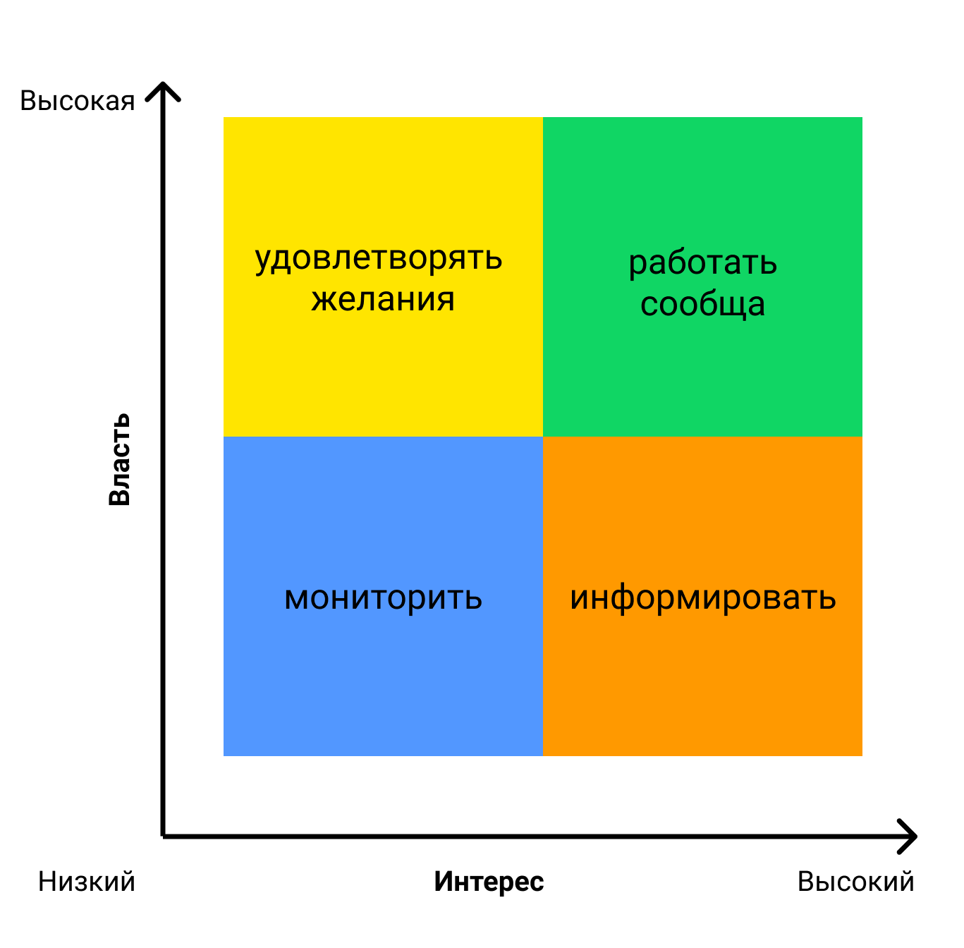Левая нижняя: «высокая власть + низкий интерес», удовлетворять желания. Левая верхняя: «высокая власть + высокий интерес», работать сообща. Правая нижняя: «низкая власть + низкий интерес», наблюдать за действиями стейкхолдера при принятии решений. Правая верхняя: «низкая власть + высокий интерес», информировать об изменениях в проекте.