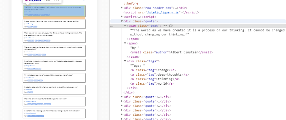 Осмотрев элементы с цитатами, замечаем, что каждый из них заключен в тег div, принадлежащий классу с названием ”quote”. При помощи вызова мы получим все элементы, соответствующие этому шаблону.