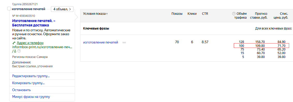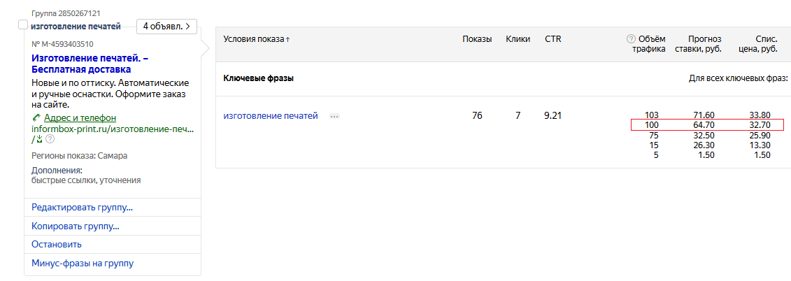 Пример из нашей практики: сравните ставки по объявлению в полночь и в 3 часа дня: