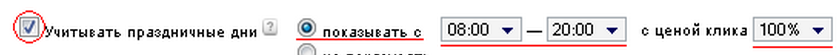 В будние дни с 9-ти до 18-ти каждый час к вам на сайт из рекламного объявления приходит 10 человек. Из них один становится клиентом. Конверсия рекламной кампании в этом случае – 10%. Примем ее за базовую эффективность РК и на это время оставляем ставку на уровне 100%.